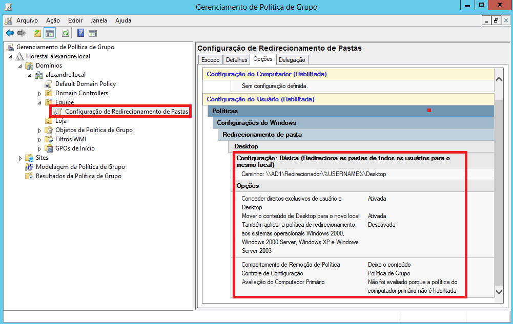 Nota: Para este cenário, foi criada uma pasta chamada Redirecionador, a pasta foi compartilhada com permissão de Controle total para o grupo Usuários do domínio. Em ambiente de produção, apenas o grupo Administradores do domínio e o grupo de usuários da OU que vai receber a política, terão que ter as permissões Controle total.